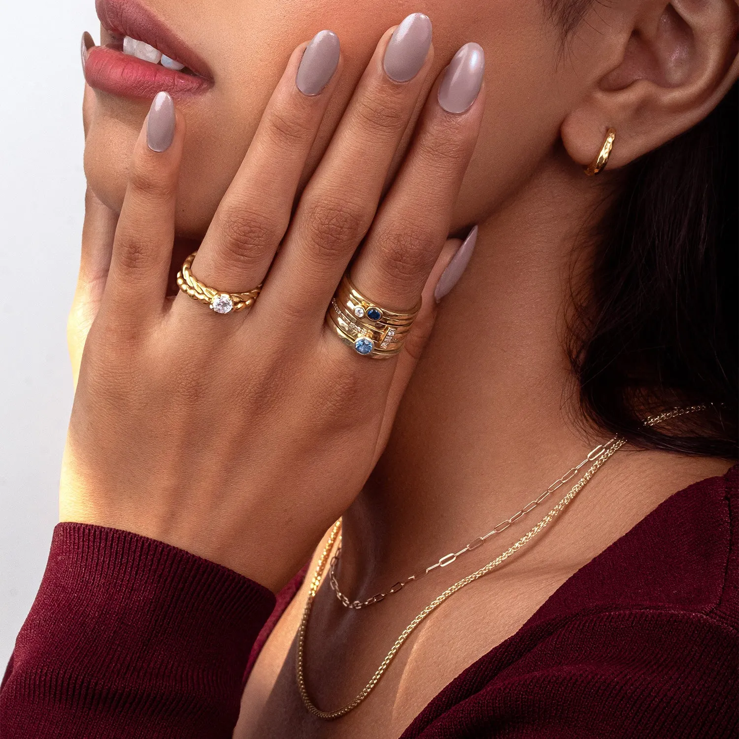Featuring our signature hammered finish on a fine band, this 14k yellow gold Narrative stacking ring is cup set with a round blue sapphire gemstone. Wear alone for a minimalist look or stack with other Narrative rings for maximum style. Available in sizes J-P. Other sizes can be handmade at an additional cost - please enquire. Stone size 3mm - approx 0.10ct. Other gemstones are available - please enquire.